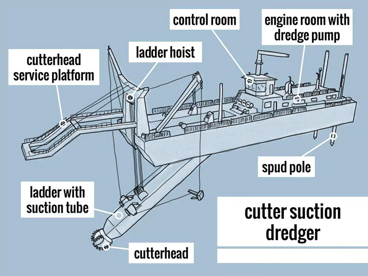 Sistema de Sucção e Descarga: A lama é transportada para a área designada de entulho através da cabeça de sucção, tubo de sucção a bordo, bomba de lama e tubo de descarga.